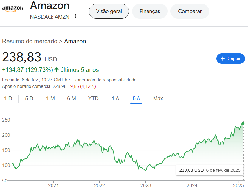 Fundada em 1994 por Jeff Bezos, a Amazon começou como uma livraria online e se tornou a maior varejista digital fora da China. O e-commerce é sua principal fonte de receita, vendendo desde eletrônicos até mantimentos, com grande participação de vendedores terceirizados.