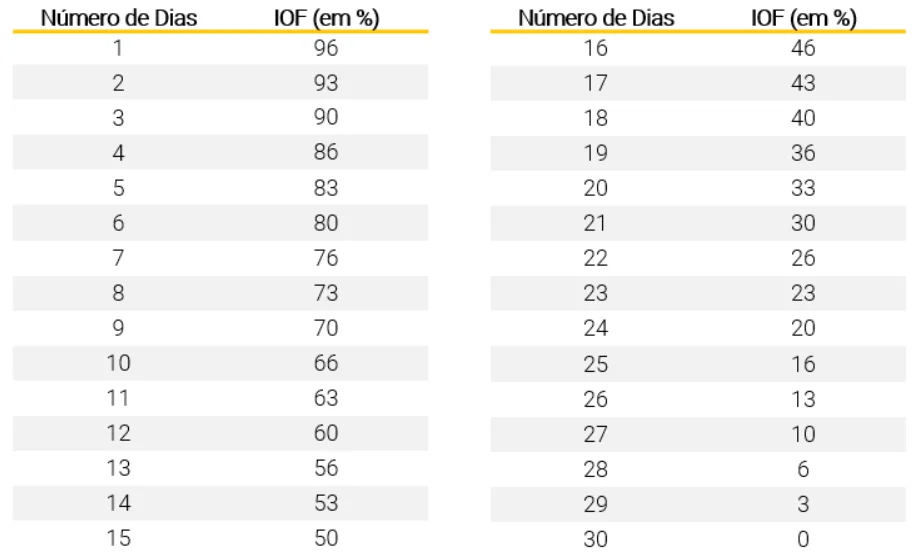 Nos fundos de renda fixa, também existe a cobrança de IOF em aplicações com menos de 30 dias de acordo com a tabela abaixo: